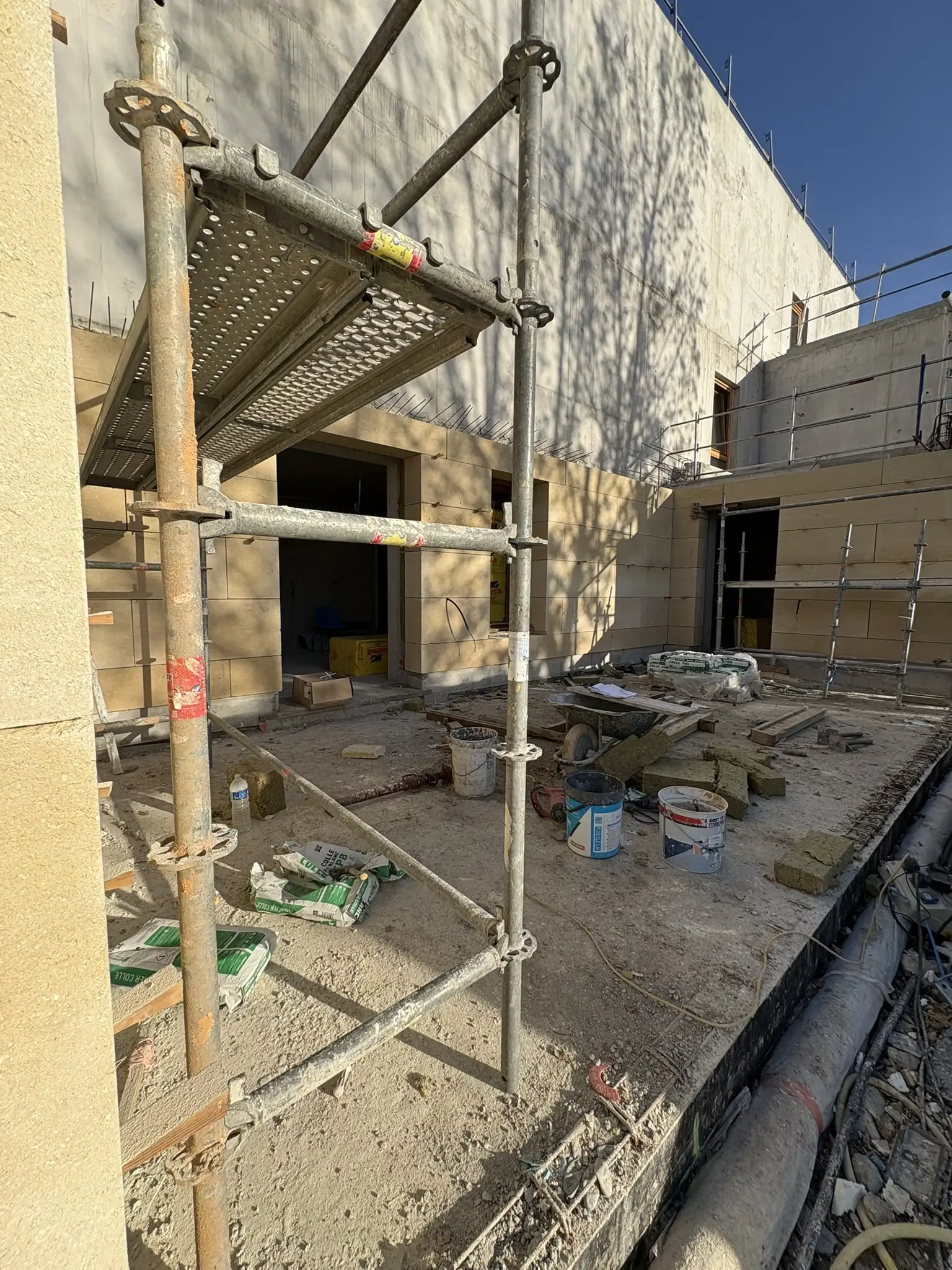 Les premières pierres de la façade viennent d’être posées… et quelles pierres ! Massives, elles donnent déjà le ton d’un bâtiment qui marquera le paysage.