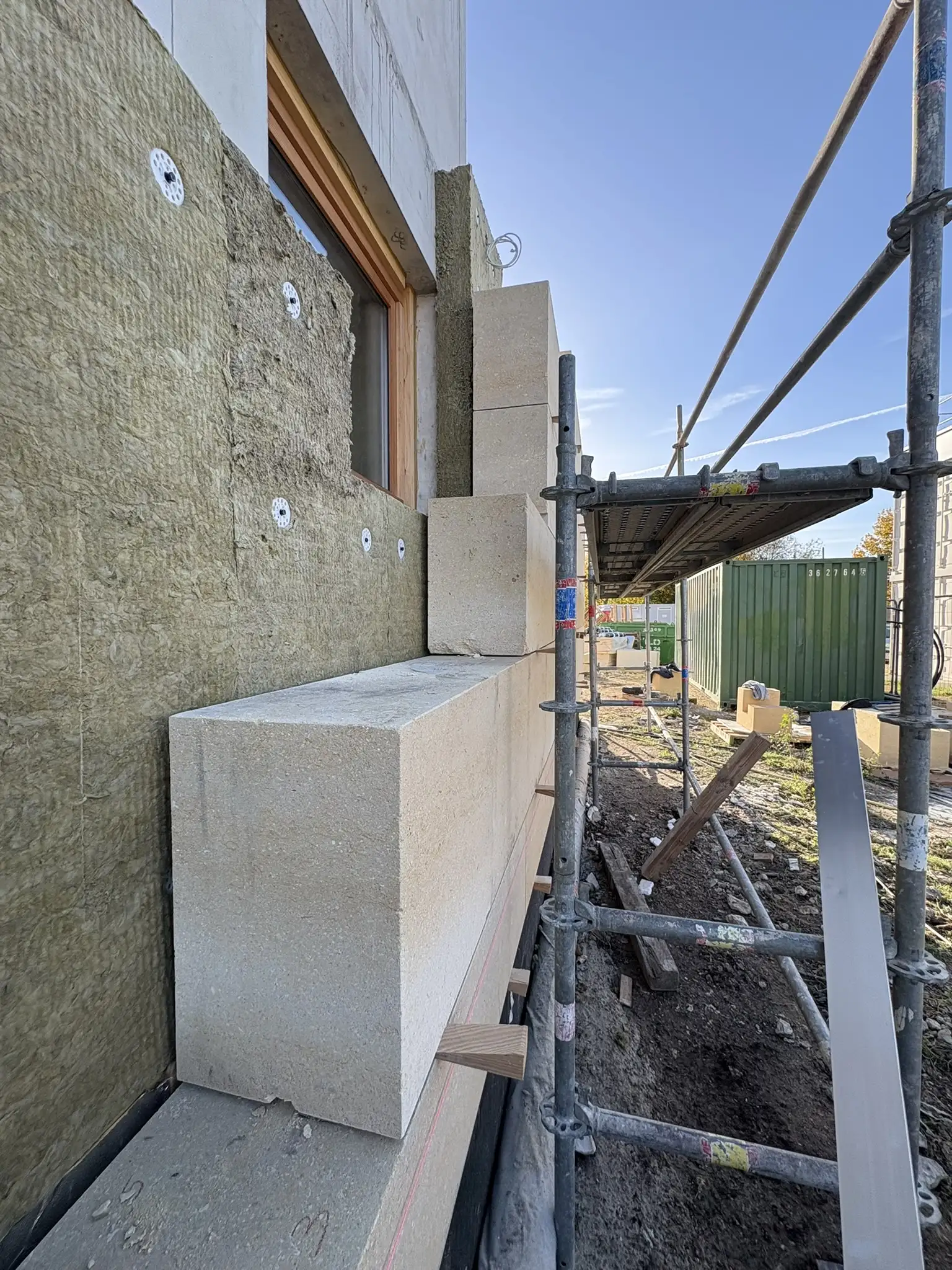 Les premières pierres de la façade viennent d’être posées… et quelles pierres ! Massives, elles donnent déjà le ton d’un bâtiment qui marquera le paysage.